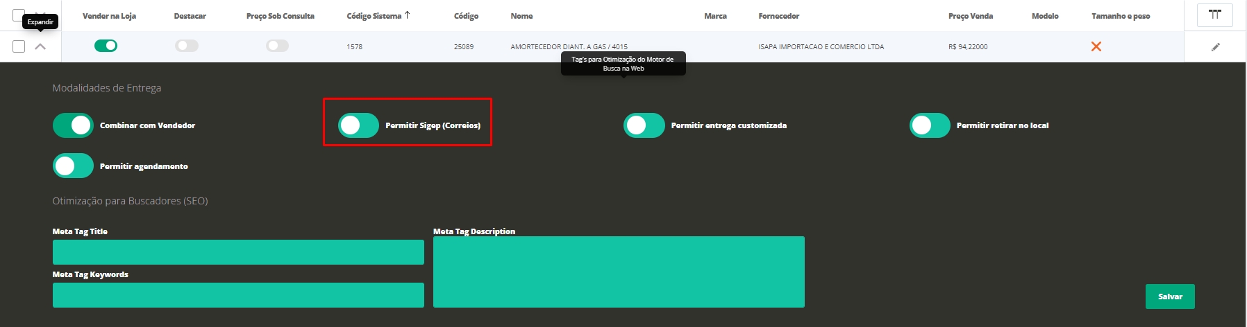 Nesta página, expanda o produto que deseja entregar através dos correios e habilite o campo Permitir Sigep (Correios). Por fim, clique em Salvar.