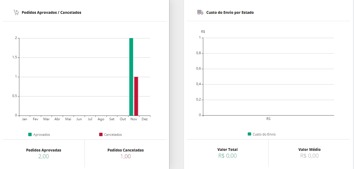 Logo após, gráfico dos seus Pedidos Aprovados / Cancelados e Custo do Envio por Estado.