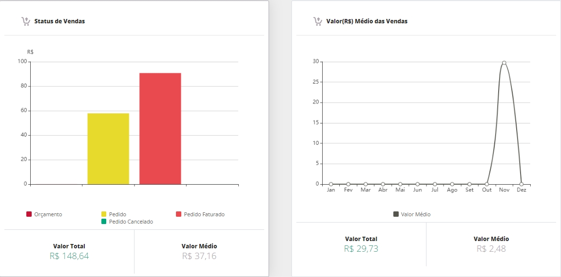 E o Gráfico Valor(R$) Médio das Vendas, com Valor Total e Valor Médio.