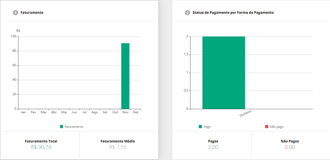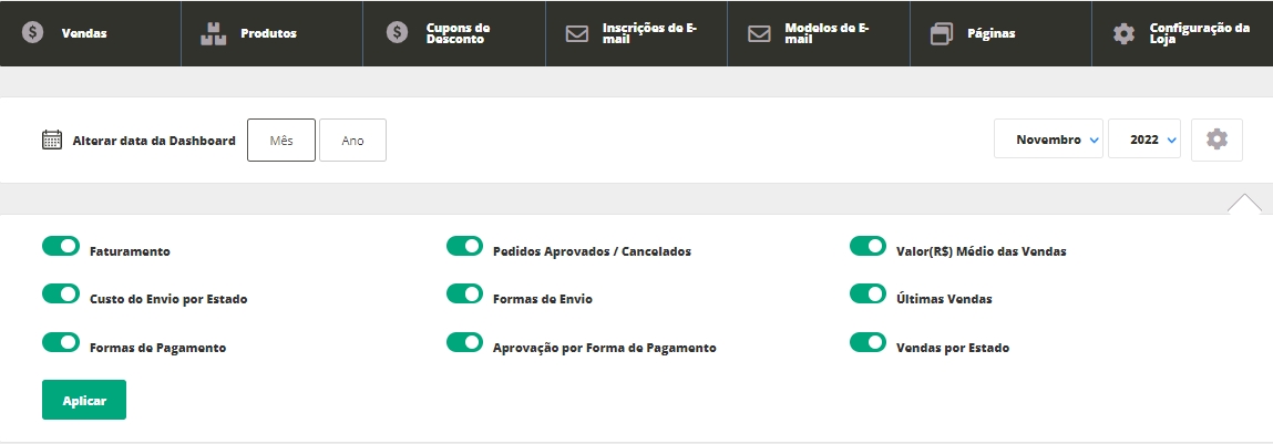 Abaixo, terá a sessão de Alterar data da Dashboard, onde você poderá selecionar se os dados do painel serão exibidos por mês ou por ano, e ainda poderá escolher qual você quer visualizar.
