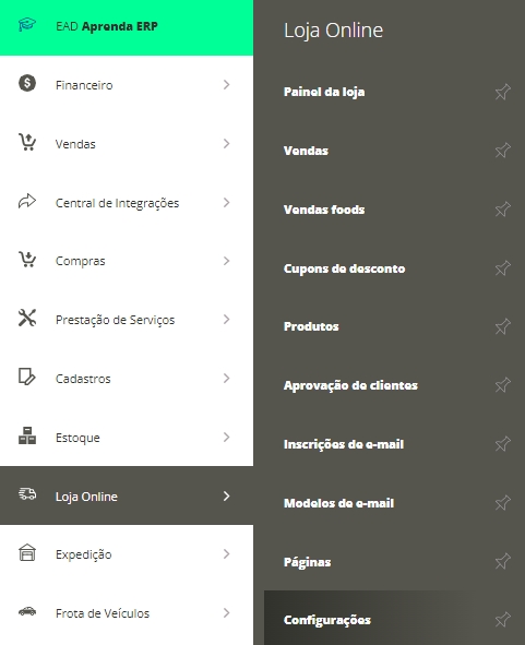 Depois de atender a todos esses requisitos, você já poderá configurar para receber notificações via e-mail. Para isso, acesse o menu lateral Loja Online, submenu Configurações, e acesse a aba Configurações.
