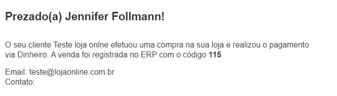 Por fim, clique em Salvar no topo da tela. Dessa forma, quando o cliente realizar uma compra na Loja Online, automaticamente será encaminhado um e-mail ao administrador e ao vendedor, informando os seguintes dados.