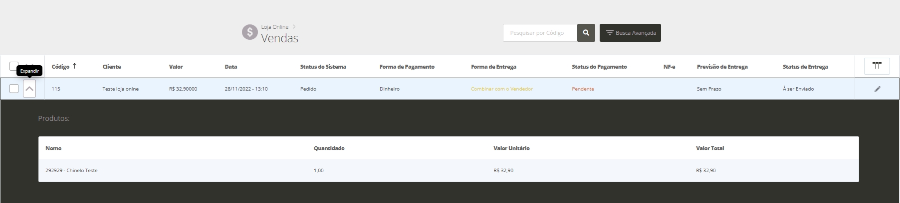 Nesta tela, serão apresentadas todas as vendas realizadas na Loja Online.