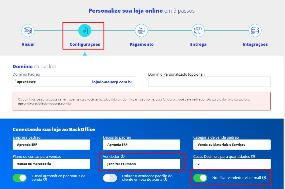 Vendedor: informe o nome do usuário vendedor que será responsável pelas vendas na Loja Online;