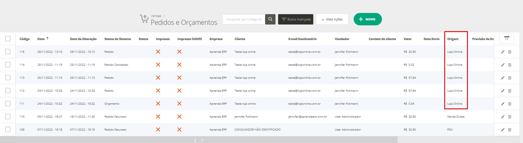 Por fim, outra possibilidade de verificar as vendas realizadas na Loja Online é através do painel de Pedidos e Orçamentos.