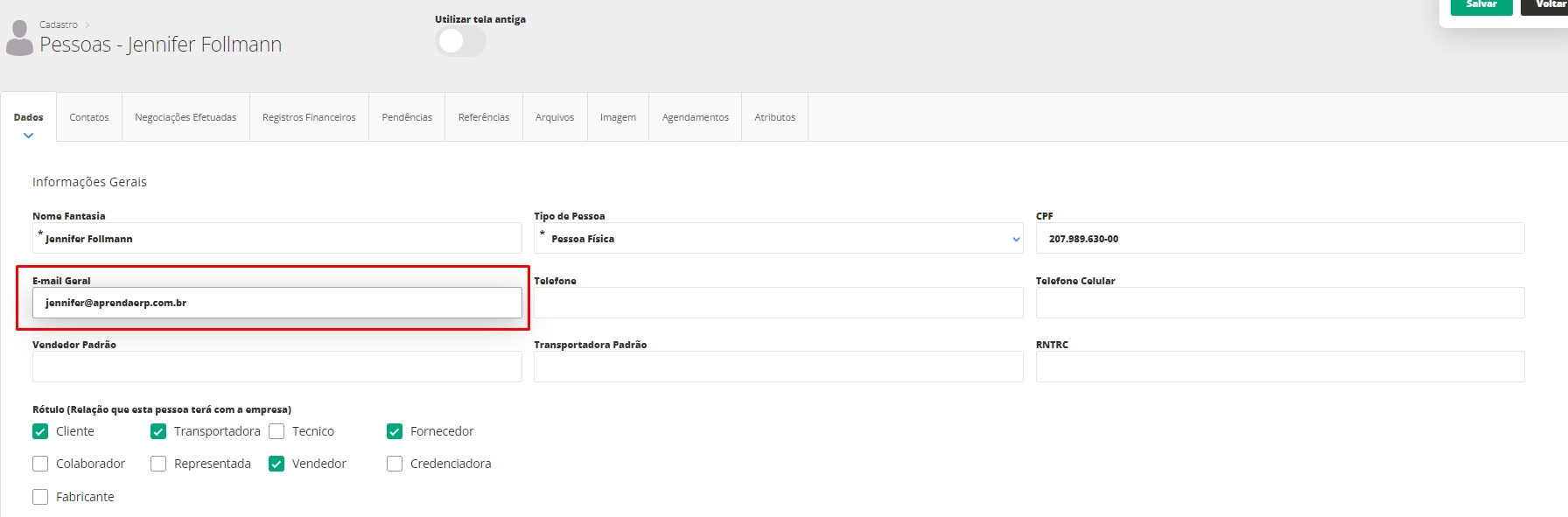 - É necessário informar o e-mail geral do vendedor, no cadastro de pessoas, conforme imagem abaixo.