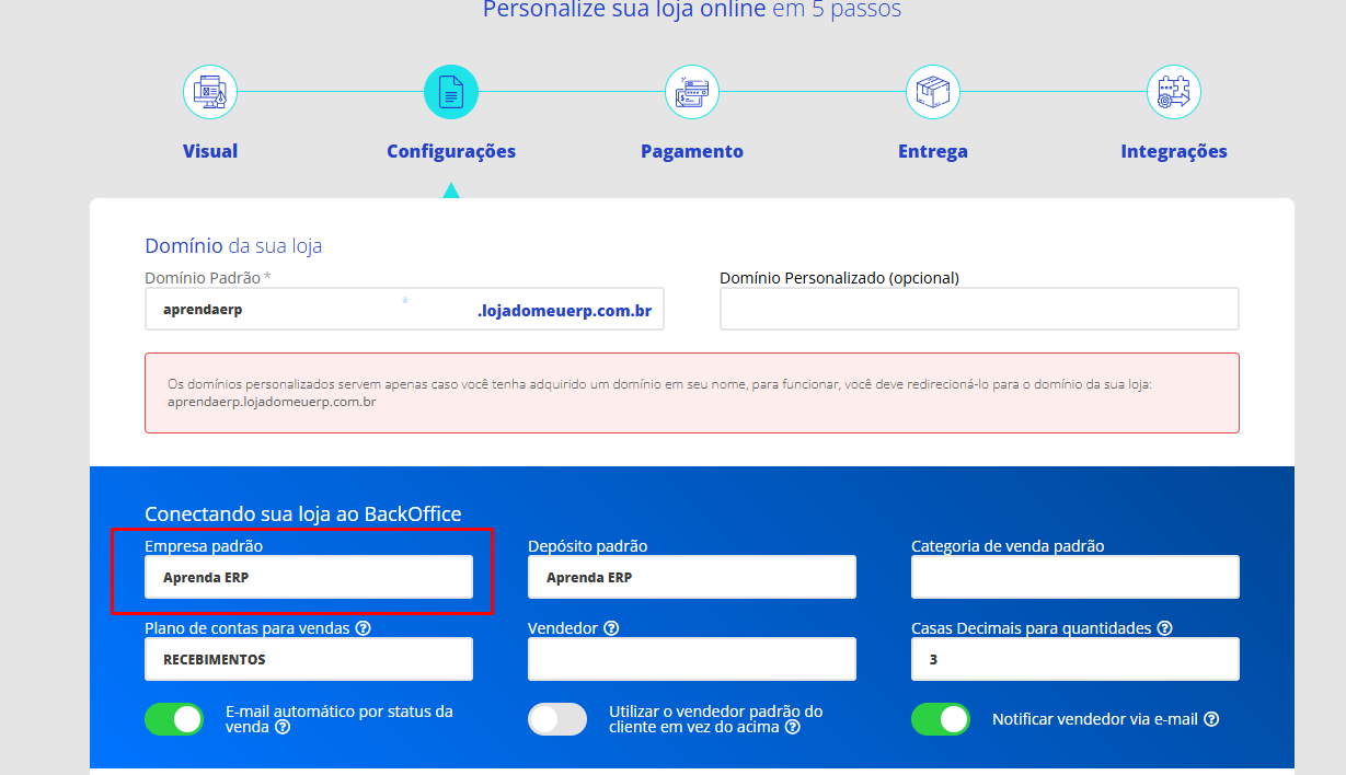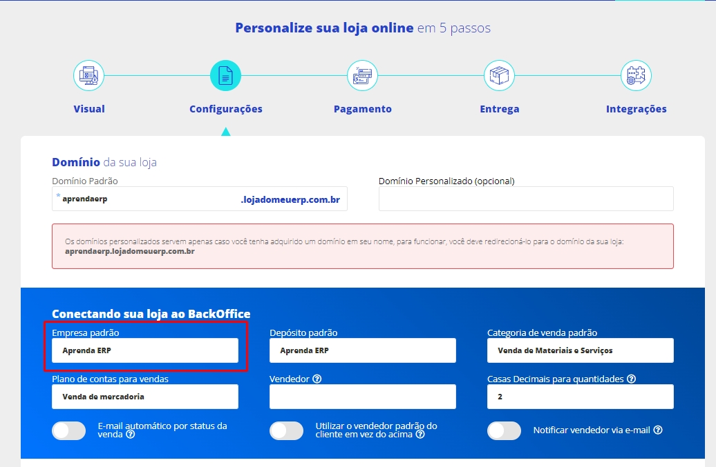 Caso deseje, poderá alterar a empresa padrão acessando o menu lateral Loja Online, submenu Configurações e acessando a aba Configurações.