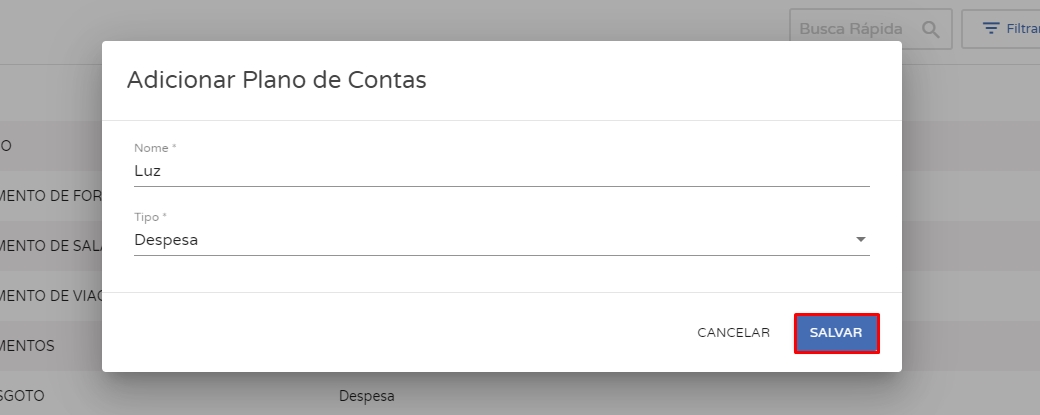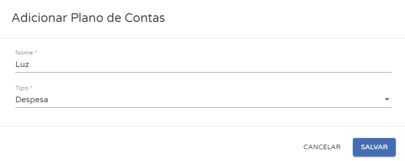 Tipo:informe se seu plano de contas refere-se a uma receita ou despesa. Seguindo o exemplo da Luz, adicionamos como despesa.