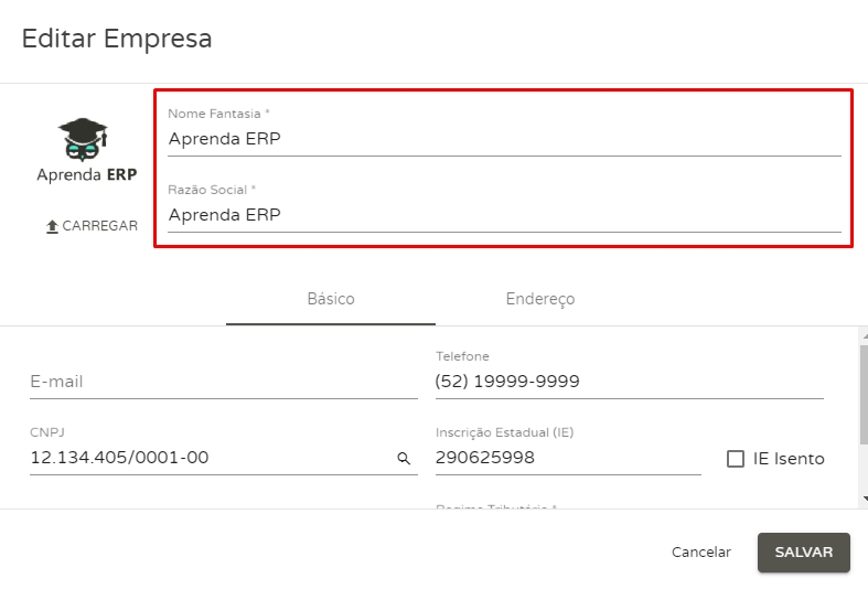 Nome Fantasia: informe o nome no qual deseja que as pessoas conheçam e chamem sua empresa, esse campo é de preenchimento livre de acordo com a informação presente no seu CNPJ; Razão Social:informe o nome oficial de sua empresa, de acordo com o nome definido no CNPJ.