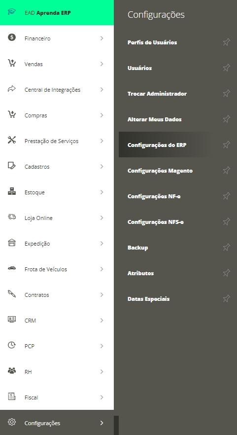 Primeiramente, será necessário entrar na plataforma Sistema ERP, para isso clique no ícone de novem no seu menu lateral. Agora você precisa acessar o menu lateral de Configurações, SubmenuConfigurações do ERP.