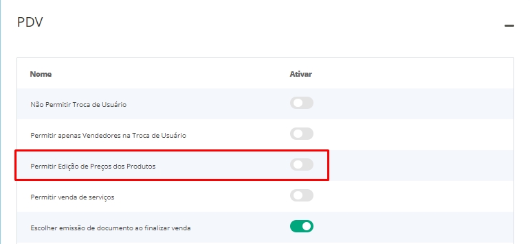 Ao expandir esta seção, habilite a opção Permitir Edição de Preços dos Produtos.