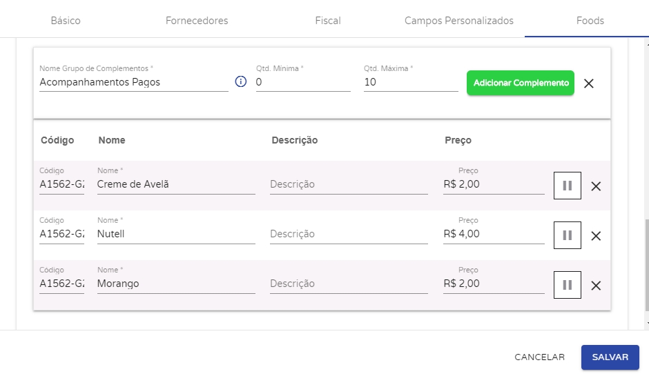 Agora, informe o nome do novo grupo e o nome dos itens. Ao clicar em Adicionar Complemento, novos campos serão abertos, onde você você inserir o nome, descrição e preço do complemento pago. Após finalizar a criação de todos os complemento, clique em Salvar.