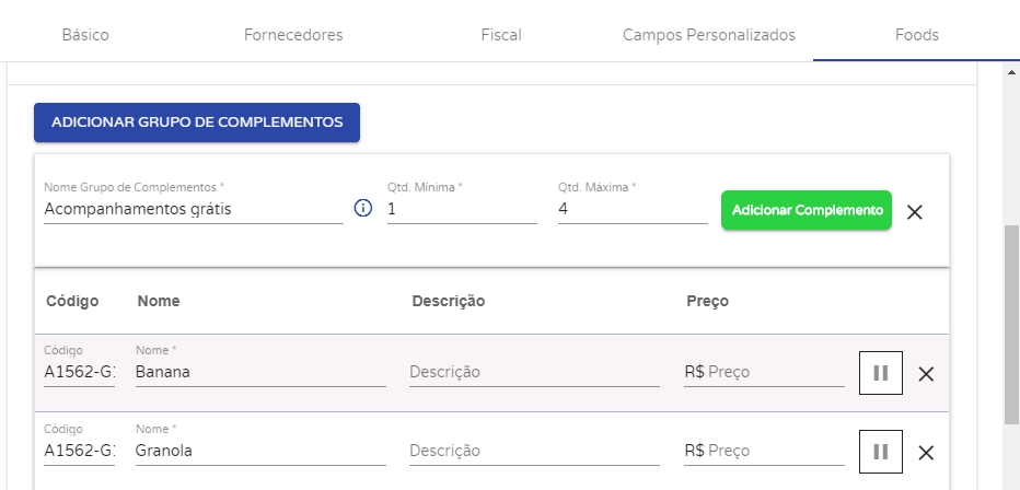 Mas caso queira criar um grupo dos Acompanhamentos Pagos, basta clicar em Adicionar Grupo de Complementos novamente.
