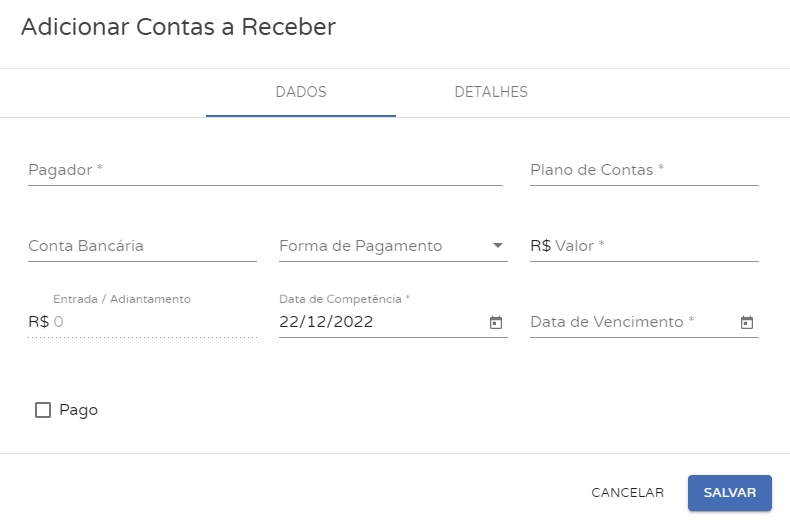Pagador: informe o cliente que pagará o valor deste lançamento. Caso o mesmo ainda não esteja cadastrado, será possível realizar o cadastro clicando na opção Criar Novo, nesta mesma tela; Categoria:selecione a qual categoria pertence o lançamento. Será a categoria que irá definir se é uma conta a receber (receita) ou uma conta a pagar (despesa). Lembre-se que o sistema já traz categorias padrão, mas que você pode adicionar novas categorias conforme as necessidades do seu tipo de negócio; Conta Bancária: selecione em qual conta bancária o valor do lançamento será movimentado. Esta conta bancária já deve estar previamente cadastrada no sistema. Forma de Pagamento: selecione a forma de pagamento utilizada neste lançamento; Entrada/Adiantamento: informe se houve algum valor de entrada, que o cliente pagou deste lançamento; Valor: informe o valor total do lançamento; Data de Competência:esta será a data de efetivação do lançamento, ou seja, a data em que a conta a receber foi efetuada. Poderá coincidir com a data de criação do lançamento; Data de Vencimento*:esta será a data de vencimento do lançamento, ou seja, a data limite para que seja feita a quitação do valor; Pago: marque esta opção quando o valor tiver sido efetuado. A data de pagamento será a mesma em que foi marcada esta opção.