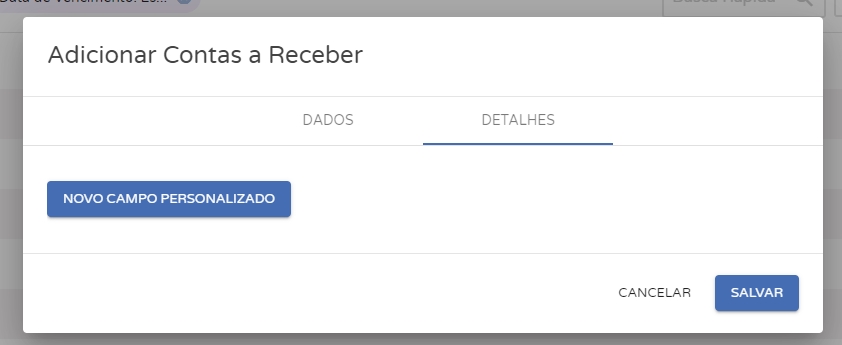 Na seção Detalhesserá possível criar campos personalizados conforme a necessidade de controle da empresa, disponibilizando mais detalhes sobre o cadastro em questão.