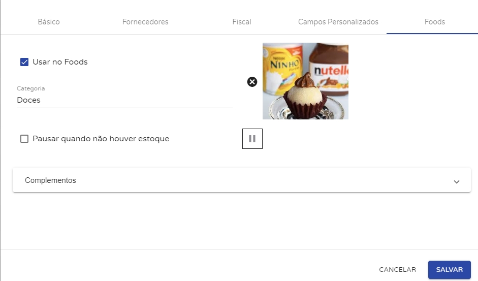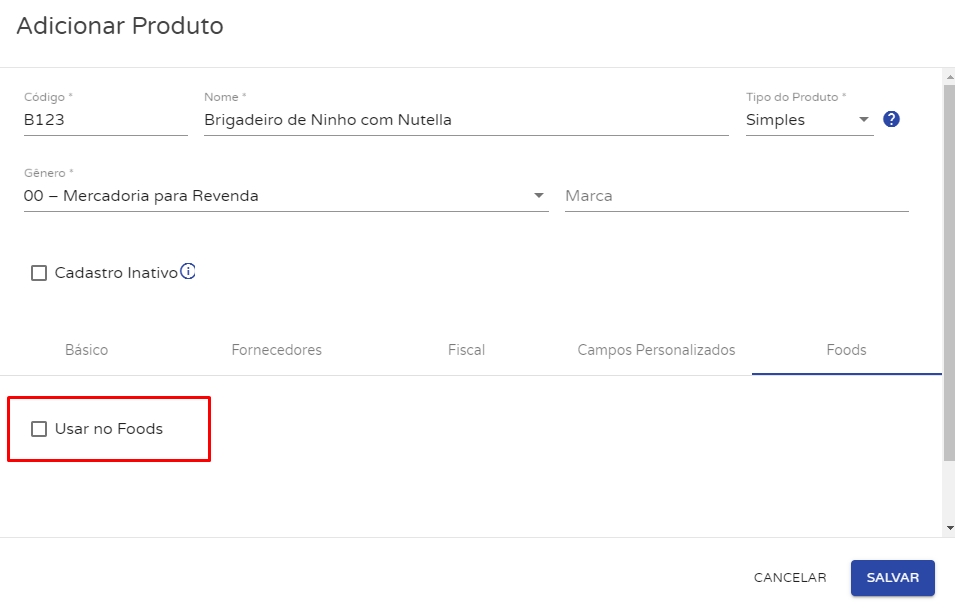 O que nos interessa neste cadastro é utilizar este produto no Foods. Para isso, após preencher as informações necessárias, acesse a aba Foods e marque a opção Usar no Foods.