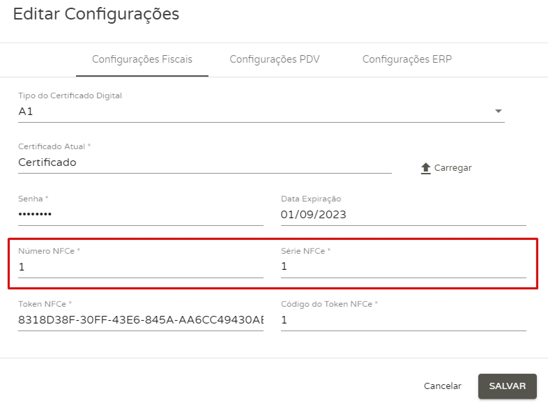 Na nova tela, vá até a aba Configurações Fiscais e no campo Número NFCe e Série NFCe, informe a numeração do último cupom fiscal emitido por sua empresa.