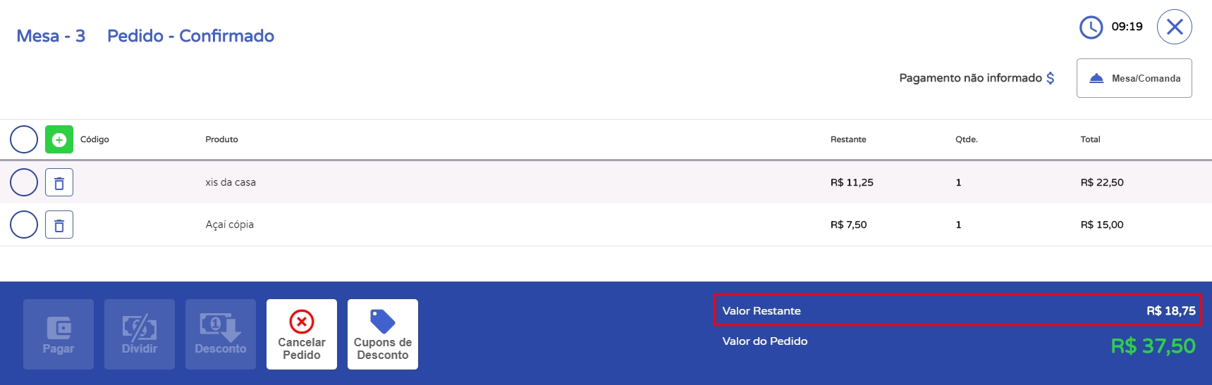 Por fim, o sistema voltará a tela da comanda, com o restante dos produtos que devem ser pagos pelos demais clientes.