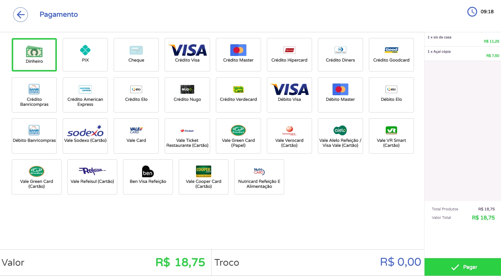 Em seguida, clique em Seguir para o pagamento. Assim, será aberto um modal com o valor que será pago por um dos clientes e ainda, apresentará todas as formas de pagamento disponíveis. Então, basta selecionar a forma de pagamento desejada e clicar em Pagar.