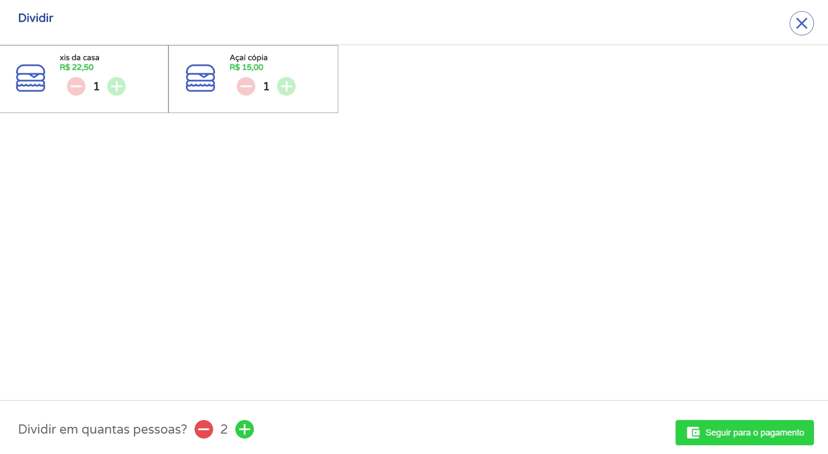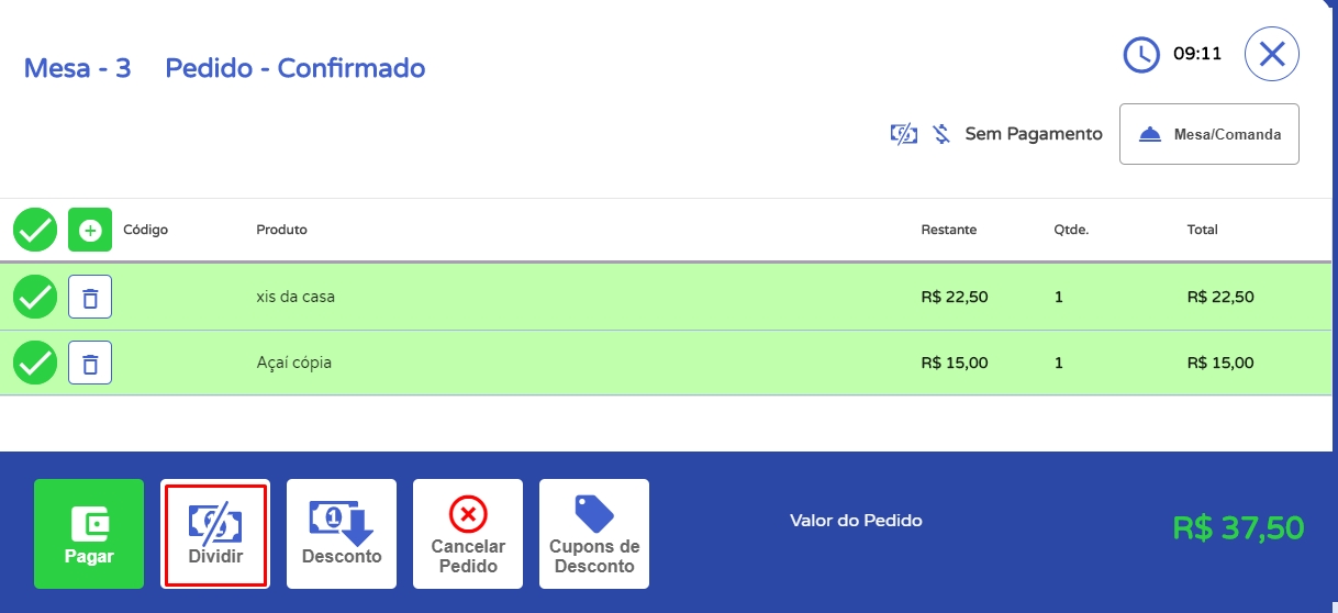 Sendo assim, será necessário selecionar novamente os produtos que serão divididos, e agora, dividir pelas pessoas que faltam pagar. Por exemplo, se antes foi dividido por 4, neste momento será divido por 3, e assim ocorrerá sucessivamente.