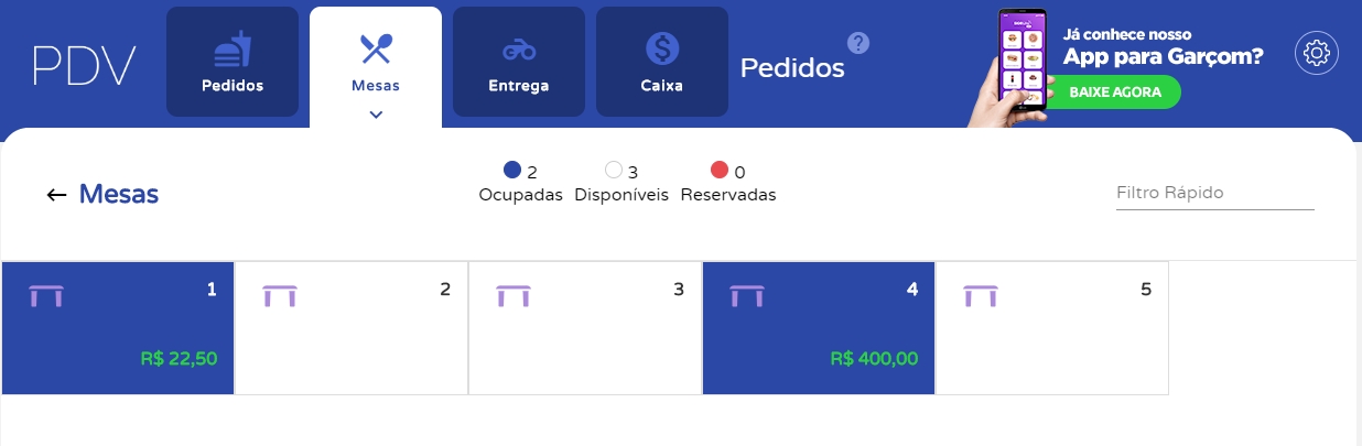Primeiramente, acesse o menu lateral Foods, submenu Pedidos. Agora, na tela de gerenciamento de pedidos, vá até a seção Mesas e Comandase localize o pedido que deseja dividir os produtos. Para realizar a divisão do pagamento, clique sobre a comanda desejada.