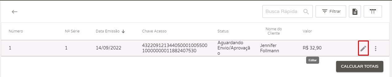 Feito isso, o sistema apresentará a listagem das Notas Fiscais emitidas. Basta editar a nota que deseja realizar a carta de correção, para isso, clique no ícone de lápis.
