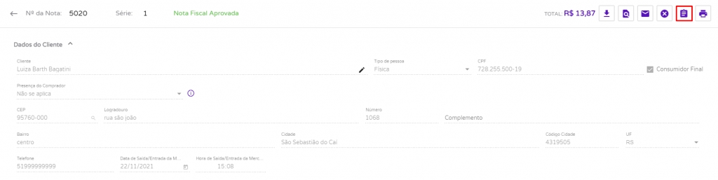 Agora, o sistema abrirá a nota fiscal e apresentará todos os dados contidos nela. Portanto, clique no ícone destacado em vermelho na imagem a seguir.