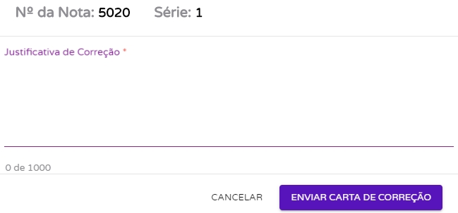 Após clicar no ícone, o sistema abrirá um modal onde você poderá informar a justificativa da correção da nota. Importante!A carta de correção deve possuir no mínimo 15 caracteres e não deve possuir caracteres especiais.