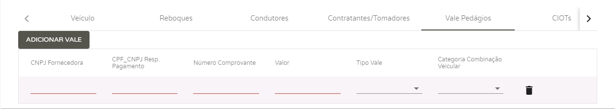 A seguir, na aba Vale Pedágios, você poderá cadastrar todas as informações sobre o vale pedágio adquirido. Basta clicar em Adicionar Vale.