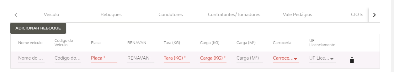 Ao lado, na aba Reboques, você poderá clicar em Adicionar Reboque, caso o veículo de transporte possua um.