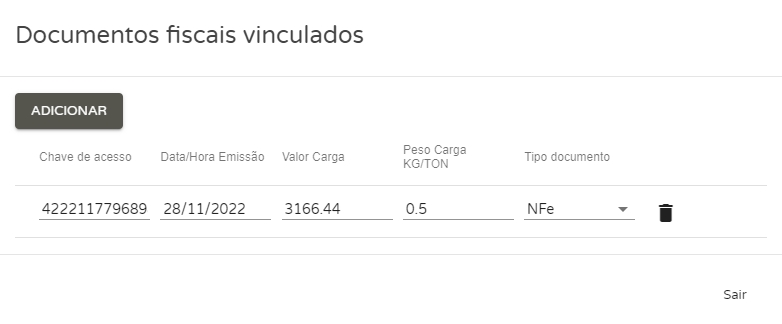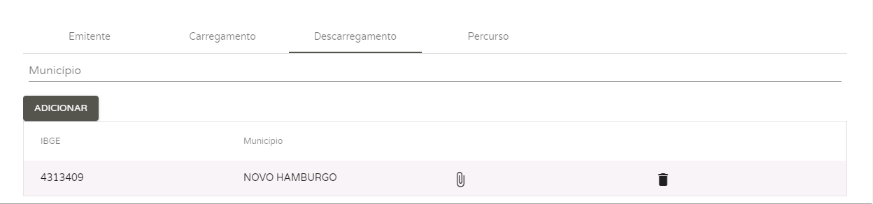Assim que você adicionar o município, ele será inserido na listagem e aparecerá o ícone de clip. Ao clicar sobre ele, surgirá um novo modal onde você deve informar os dados da NF-e que está sendo transportada, como: chave de acesso, data da emissão, valor e peso da carga e tipo de documento (CT-e ou NF-e).