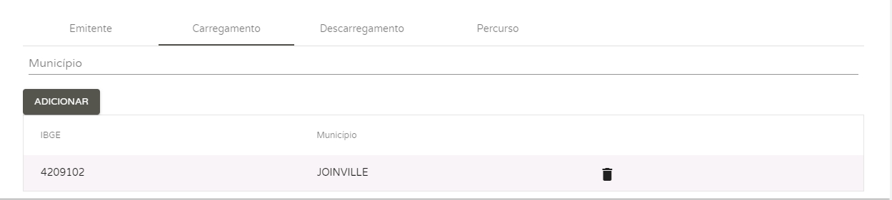 Ao lado, na aba Carregamento, informe a(s) cidade(s) onde as mercadorias serão coletadas para que o transporte seja iniciado.