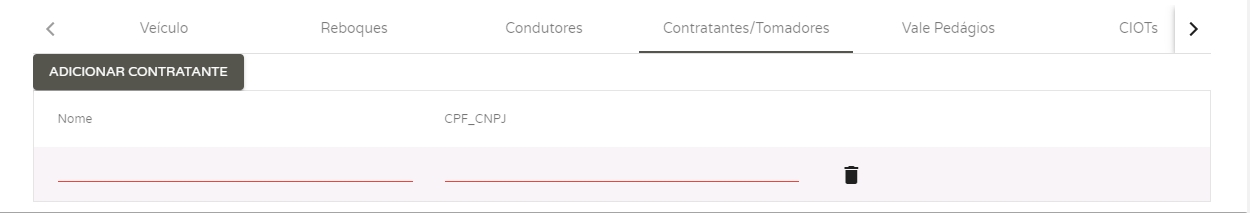 Na próxima aba Contratantes/Tomadores, você poderá adicionar o nome e CPF/CNPJ da empresa que contratou o serviço de transporte. Para isso, basta clicar em Adicionar Contratante. Lembrando que este contratante deve estar previamente cadastrada como Pessoa em seu sistema.