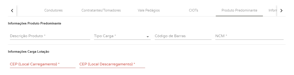 Descrição Produto: selecione o produto predominante; Tipo Carga: selecione o tipo de carga deste produto; Código de Barras: informe o código de barras deste produto; NCM: informe o NCM do produto.