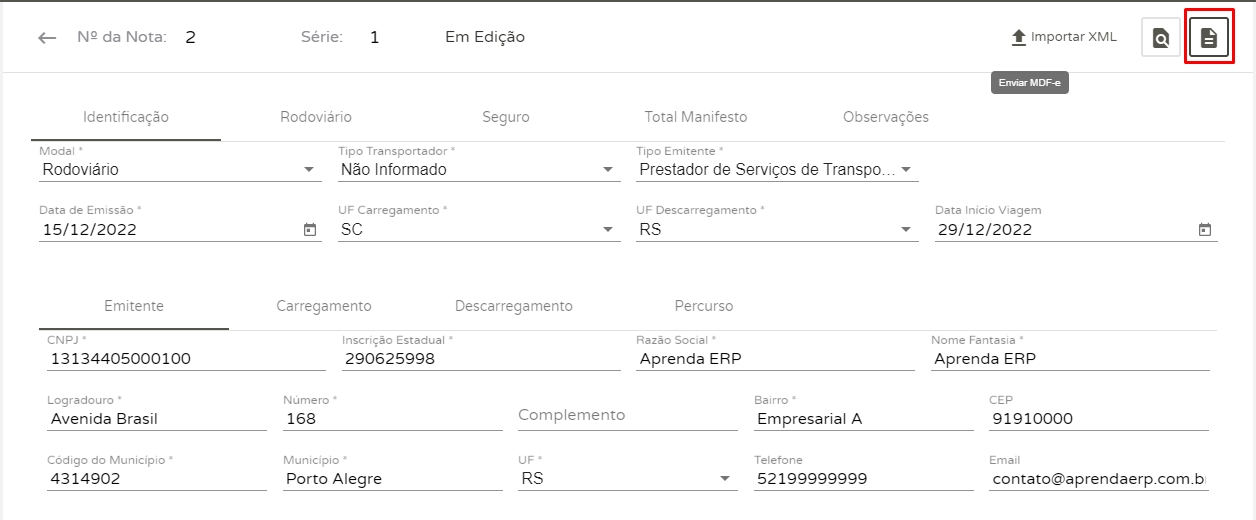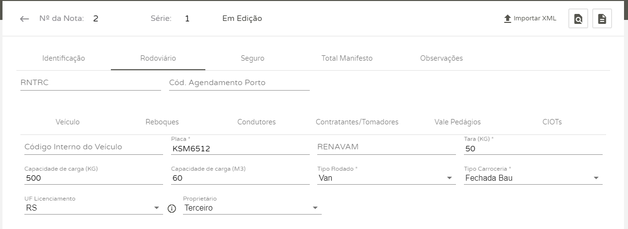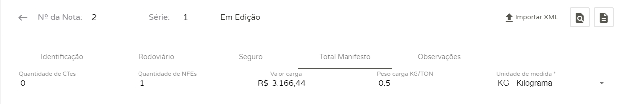 Importante!Ao informar o valor da carga e o peso, caso possuir casas decimais, informe um ponto finalao invés de vírgula. E ainda, caso você não deseja preencher todos estes campos manualmente, conte com a opção de Importar XMLno topo da tela do MDF-e.