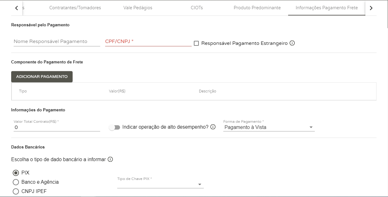 Nome Responsável Pagamento: informe o nome do responsável pelo pagamento do frete; CPF/CNPJ: informe o CPF/CNPJ do responsável pelo pagamento do frete; Adicionar Pagamento: clique aqui para adicionar o tipo, valor e descrição do pagamento do frete; Valor Total Contrato: informe o valor total da contratação do serviço; Forma de Pagamento: selecione a forma de pagamento do contrato; Dados Bancários: marque a opção de pagamento e preencha os dados que aparecerão de acordo com a opção marcada.