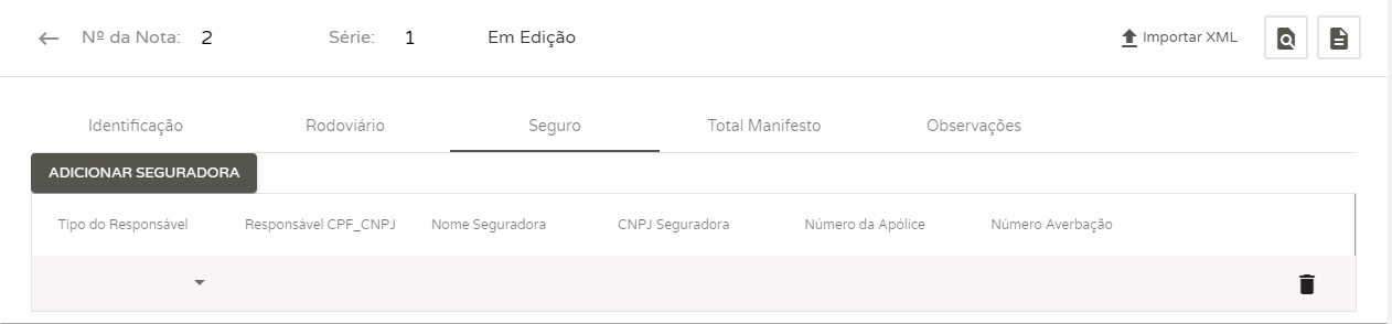 Tipo do Responsável: selecione quem será responsável pelo seguro; Responsável CPF/CNPJ: informe o CPF/CNPJ do responsável; Nome Seguradora: informe o nome da seguradora; CNPJ Seguradora: informe o CNPJ da seguradora; Número da Apólice: informe o número da apólice do seguro; Número Averbação: informe o número da averbação das cargas que serão transportadas.