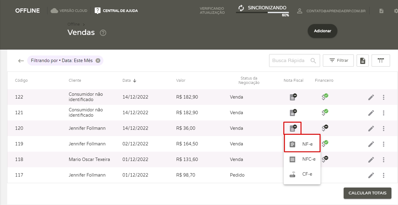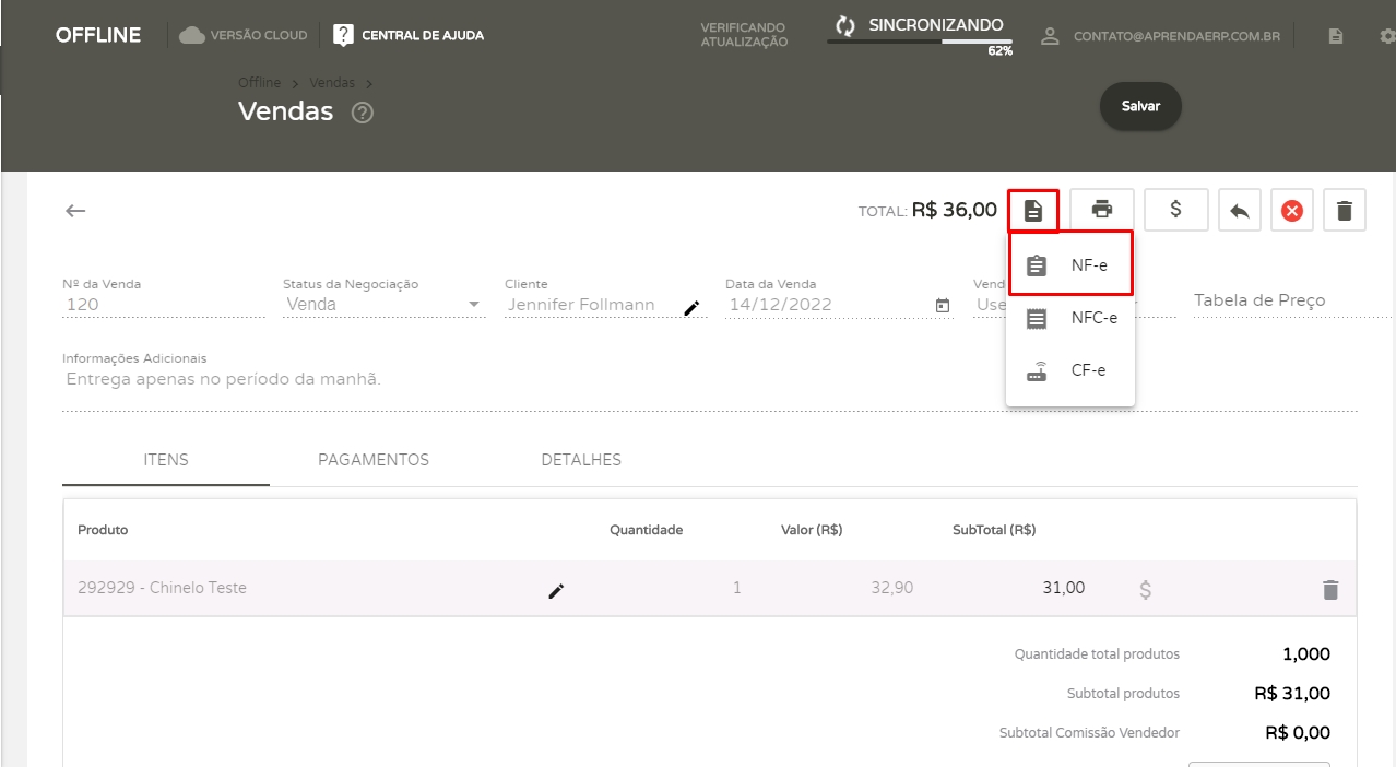 Primeiramente, é necessário já ter realizada a venda em seu sistema, e ela precisa estar com o status “Venda”. Ou seja, já precisa ter ocorrido a baixa no estoque e gerado o lançamento financeiro da venda. Caso deseja saber como realizar vendas no Offline, recomendamos este artigo: Como gerar Pedidos e Orçamentos no Offline.
