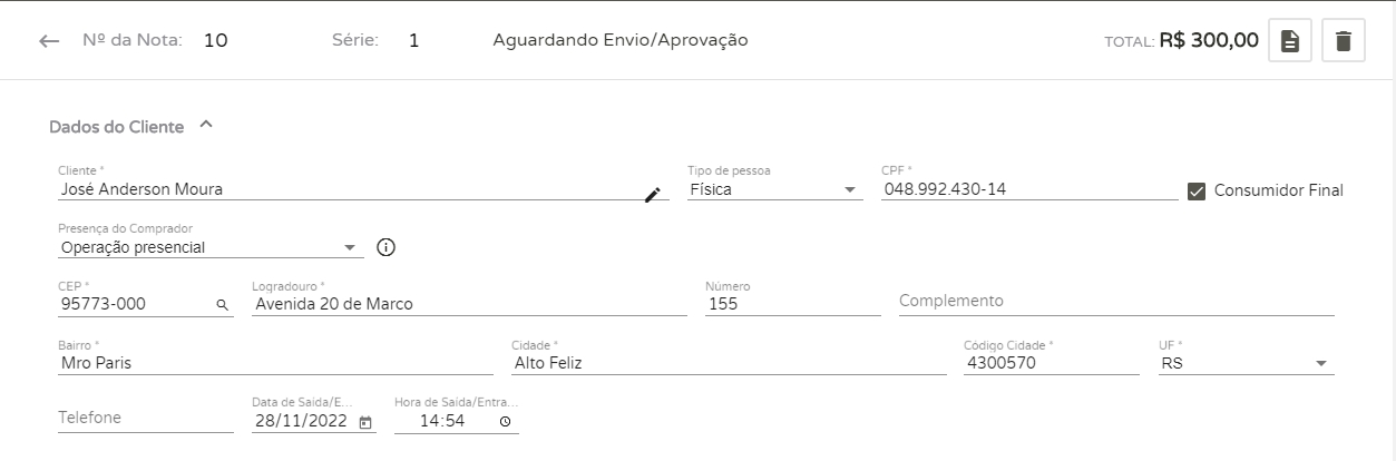 Em seguida será exibida uma tela onde você deve informar todos os dados da nota fiscal. Ao informar um cliente já cadastrado no sistema, o Offline fará o carregamento automático dos dados desta pessoa. Caso o cliente não esteja cadastrado no seu sistema, você poderá criar um novo cadastro diretamente pela tela da nota fiscal