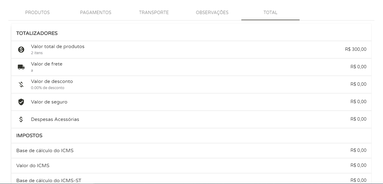 Por fim, na aba Totalvocê poderá verificar o totalizador com todas as informações da nota fiscal.
