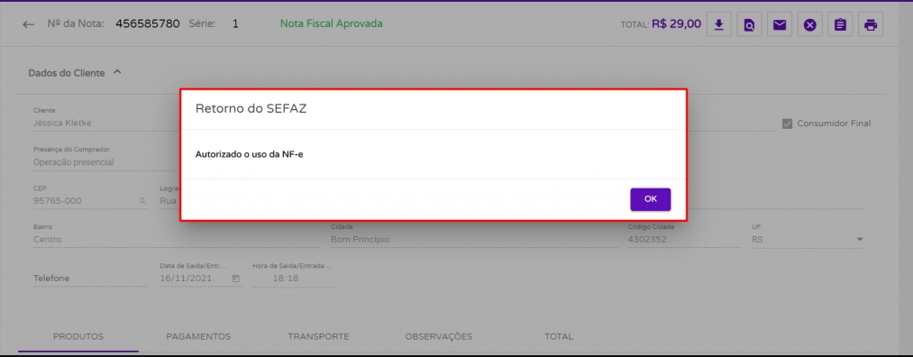 Então, se abrirá na sua tela uma pré-visualização da nota (sem valor fiscal). Portanto, verifique se todos os dados estão corretos e, no final da página clique em OKpara confirmar o envio da NF-e.