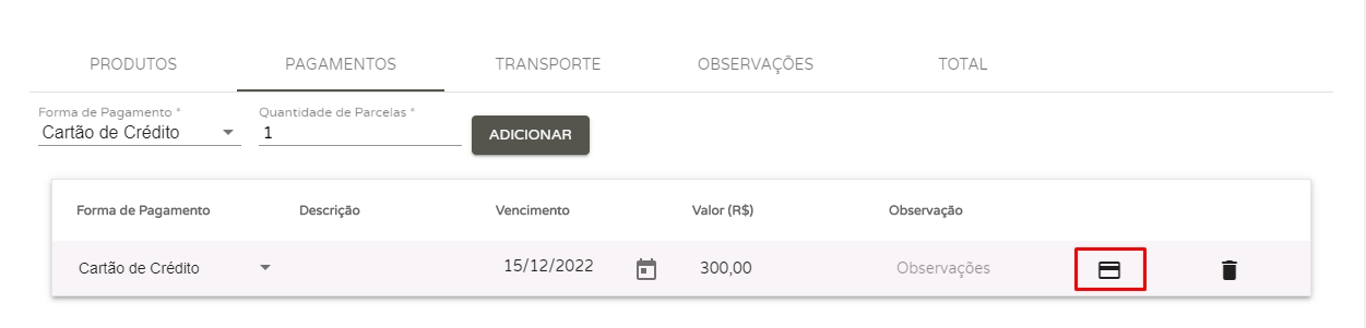 Depois de informar todas os dados dos produtos, acesse a aba Pagamentos, selecione a forma de pagamento e a quantidade de parcelas para esta nota. Assim que você adicionar estes dados, você poderá definir a data de vencimento de cada uma das parcelas, e caso tenha selecionado a forma de pagamento cartão de crédito ou débito, insira os dados do cartão e da credenciadora responsável pela transação.