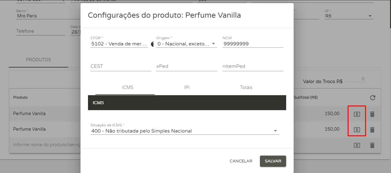 Ainda nesta tela, ao clicar sobre o ícone de cifrão ($) você poderá informar os dados de impostos de cada produto, como a Situação do ICMS, IPI, PIS, COFINS e CFOP. Importante!Caso sua empresa seja do regime de apuração Simples Nacional, não aparecerá opções para informar PIS e COFINS, pois estes impostos são pertencentes ao regime de apuração Lucro Presumido/Real.