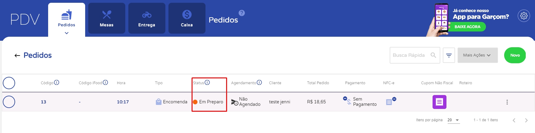 Após realizar o pedido, você deve enviá-lo a cozinha para ser preparado. Para isso acesse o menu lateral Foods, submenu Pedidos.