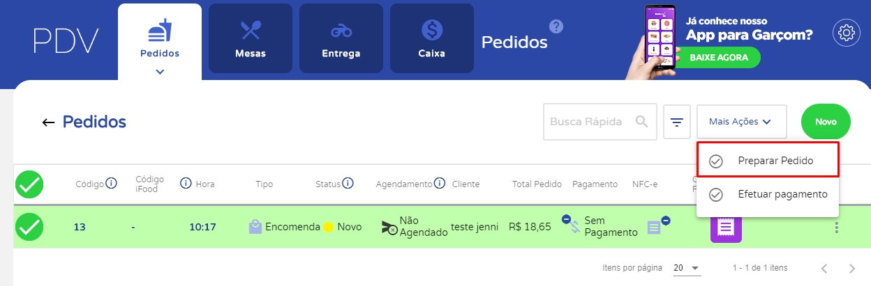 Nesse momento, se abrirá o painel de controle de pedidos. Selecione o pedido que deseja mandar para o preparo e em Mais Ações, clique em Preparar Pedido.