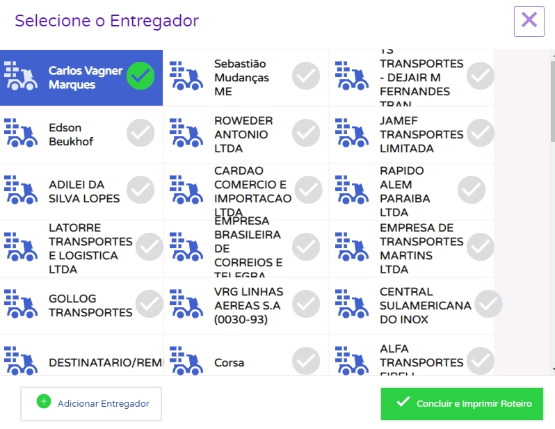 Em seguida, o sistema solicitará a escolha do motoboy. Após escolher, basta clicar em Concluir e Imprimir Roteiro.