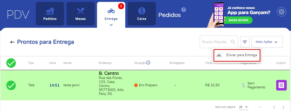 Agora, selecione o pedido e em Mais Ações, clique emEnviar para Entrega.