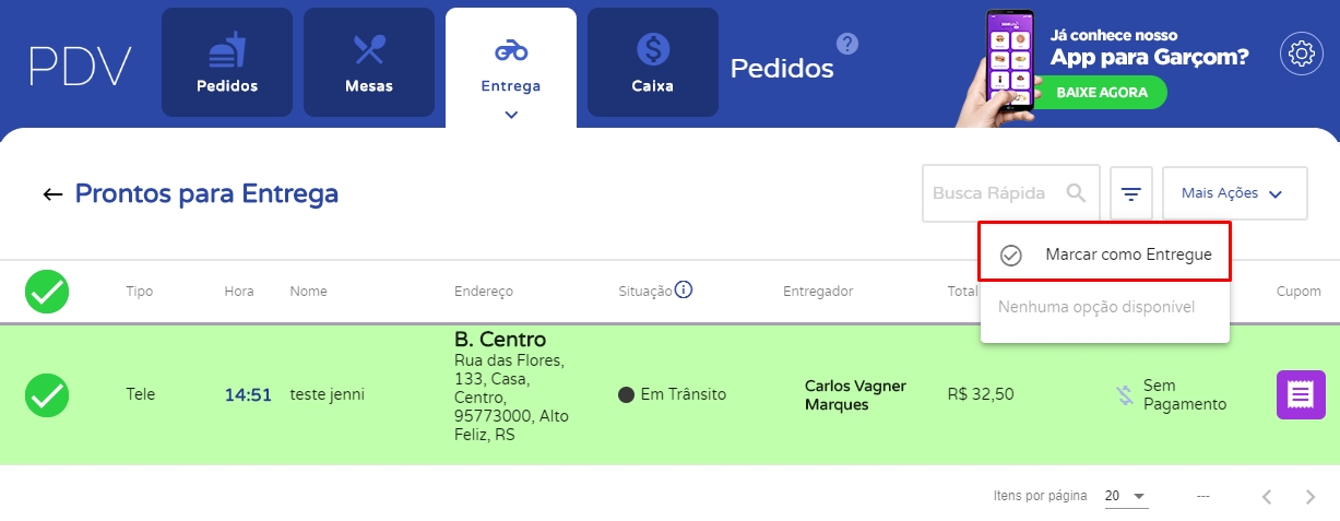 Com o pedido já entregue ao cliente, basta você selecioná-lo novamente e no Mais Ações, clicar em Marcar como Entregue.