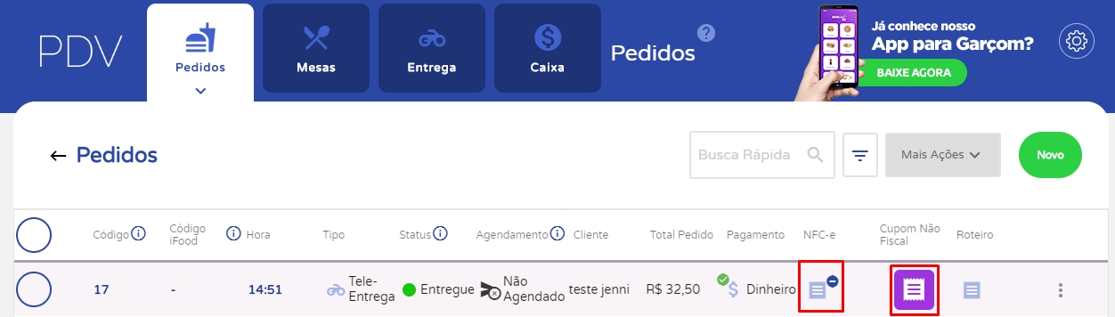 Agora você poderá gerar a NFC-e, clicando no ícone destacado em vermelho ou gerar o Cupom não Fiscal, clicando no ícone destacado em azul.