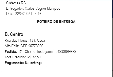 Assim, o sistema apresentará um roteiro de entrega, que pode ser impresso e entregue ao motoboy.